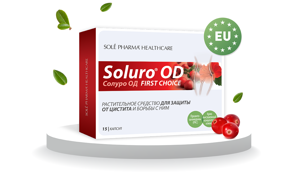 - Soluro® OD можно принимать с антибиотиками. Для получения дополнительной информации об использовании клюквы и ее воздействии на организм обращайтесь к своему гинекологу или урологу.